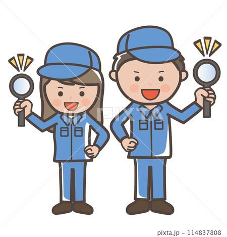 虫眼鏡を持って点検をするイメージの男女作業員、清掃員のイラスト