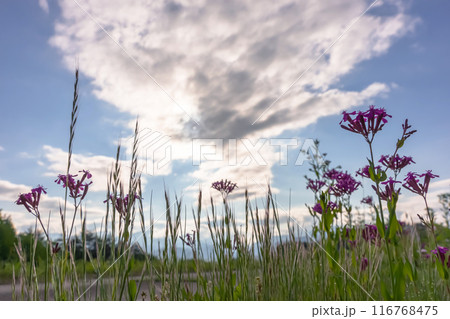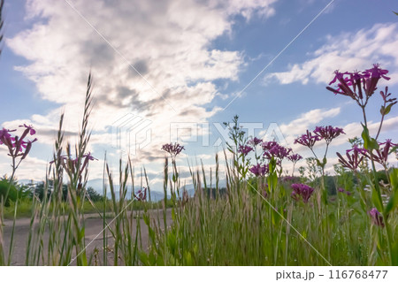 初夏の公園に咲くピンク色のムシトリナデシコの花とマツバボタンの花