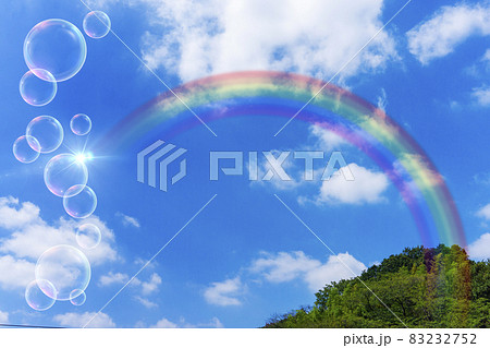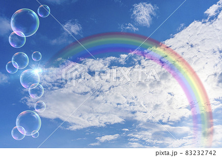 虹がかかった青空と雲とシャボン玉の背景素材_e_20