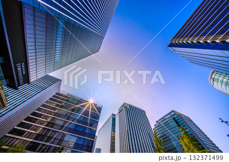日本の横浜都市景観珍景。太陽を囲む淡いリングの不思議な光景…新高島駅前の摩天楼などを望む