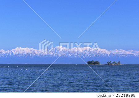 海越しに望む冬の立山連峰と虻が島