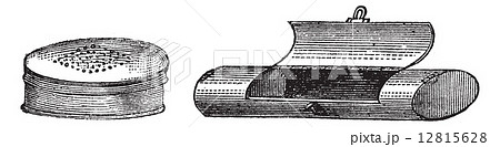 Fishing gear, Worm and maggot box. , vintage engraving.