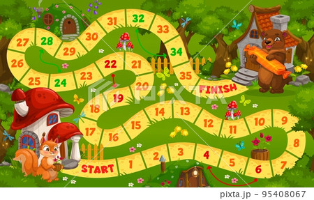 Kids boardgame with mushroom, acorn, carrot, beehive, snail and shell houses. Vector step board game with numbered snake path, walk puzzle for family or children activity. Dice riddle with fairy homes