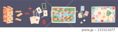 Flat cartoon boardgame set with colorful game elements. Includes blocks game, poker chips, and snake path tiles. Features dice, money, table cards for fun entertainment. Ideal for childhood leisure,