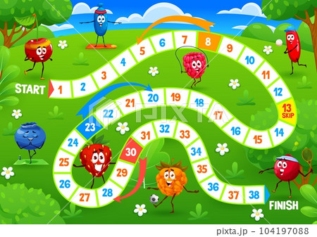 Kids board game cartoon cheerful berry characters on summer meadow. Vector step boardgame with cherry, honeyberry, blueberry and strawberry. Cloudberry, cranberry, barberry and raspberry on snake path