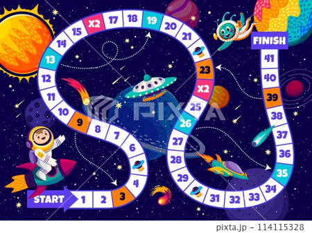 Kids board step game with kid astronaut and space planets. Vector boardgame worksheet with snake path, numbers and cartoon cosmonaut character on rocket, ufo and alien. Educational children riddle