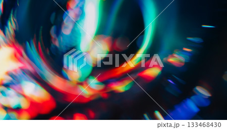Blur lens leak. Flare blend. Blue green red neon light mix color. Faceted circle prism shimmering reflection texture abstract dark background.