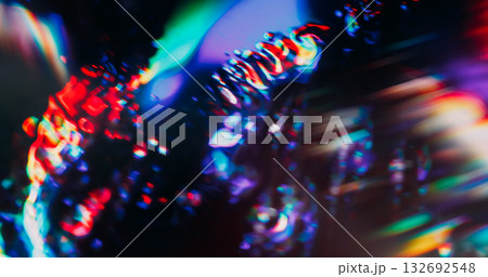Blur disco leak. Gradient light reflection. Bokeh colorful mix kaleidoscopic flare in glass prism. Abstract neon luminosity glitter background.