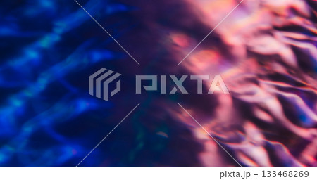 Blurred light flare. Defocused color background. Purple blue neon ribbed texture. Mystic water wave surface abstract luminosity flow.