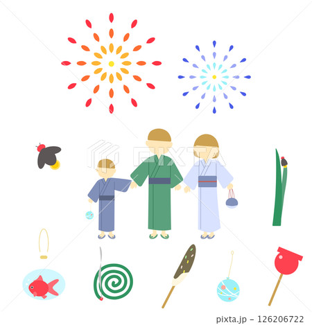 花火を見ている浴衣の親子と夏のアイコンセット