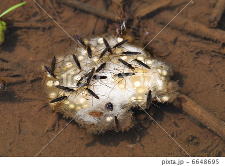 シュレーゲルアオガエルの卵に群がるアメンボ