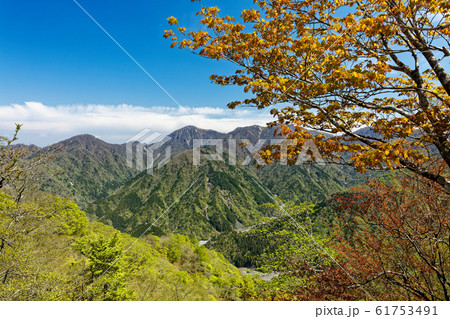丹沢・鍋割山稜から見る新緑のユーシン渓谷と蛭ヶ岳の山並み