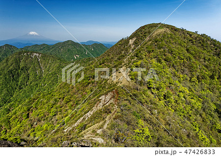 新緑の丹沢・蛭ヶ岳稜線から見る富士山と檜洞丸
