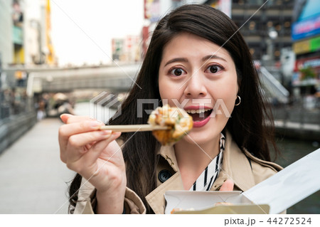 Young woman eating street food in walking at street shopping center Dotonbori in Osaka, Japan.