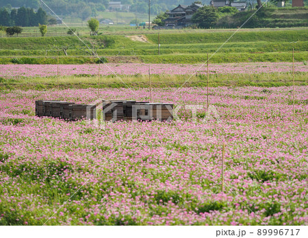 レンゲ畑にハチの巣箱が並ぶ里山の光景