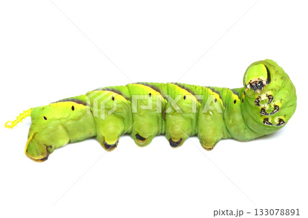 生き物 昆虫 クロメンガタスズメ、成虫は髑髏マークが特徴。幼虫も不気味系ですが、巻いた尻尾がチャームポイント。ヒヨドリジョウゴで食事中