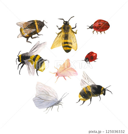 Clouded yellow butterfly, common brimstone, striped fluffy bumblebee wasp, insect bug moth isolated illustration hand drawn in watercolor. Honey jars, beeswax products, garden herbal teas packaging