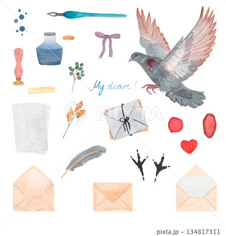 Pigeon with letter and set mail watercolor illustration. Post pigeon and message hand drawn illustration. Clipart set isolated on a white background