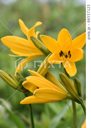 北海道 花 6月 縦向き 写真素材 エゾカンゾウ、咲き始めの花が3個とつぼみ、縦アップ