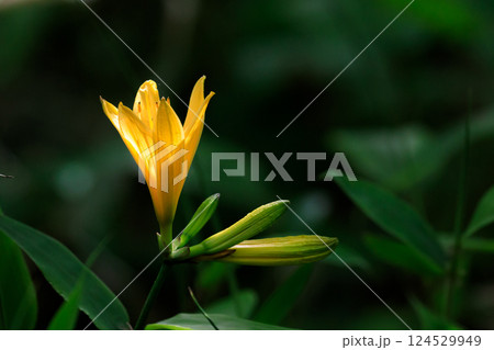 花 黄色 エゾカンゾウ白抜きの花とつぼみ一輪 写真素材 6月【撮影地:北海道】