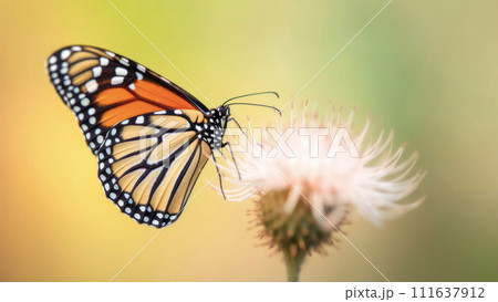 AI-generated content. macro Photo of Monarch butterfly on single pastel flower.