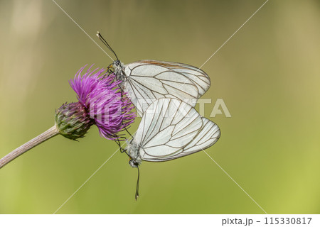 Black-Veined White butterflies (Aporia crataegi) mating in a natural meadow in spring.