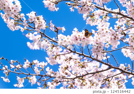 桜の花と蝶々(アカタテハ)「湯の温かさと桜の美しさに癒やされる」天岩戸の湯(宮崎県西臼杵郡高千穂町)