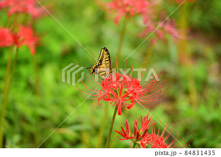 埼玉県幸手市内国府間 県営権現堂公園の一面の曼珠沙華(彼岸花)群生のなかを舞うアゲハチョウ