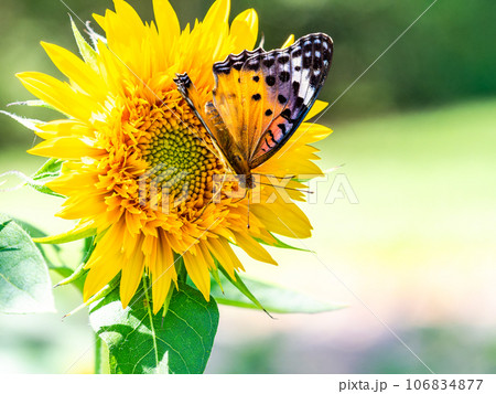 真夏の景色 満開のヒマワリにとまるかわいいツマグロヒョウモン蝶