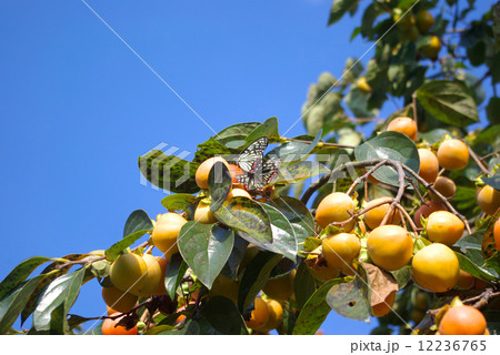 たわわに実る柿の実とその実に止まるアカボシゴマダラ