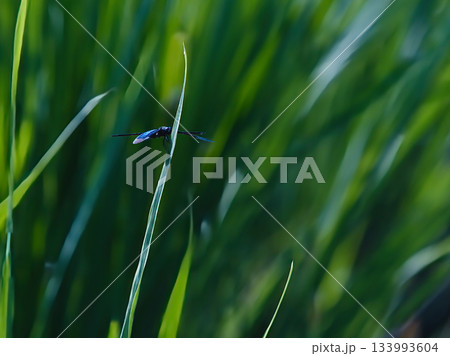 イネ科の葉に止まるトンボ