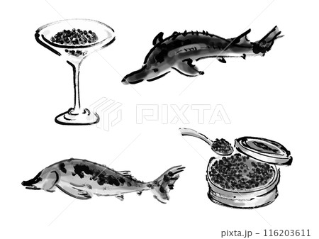 蝶鮫とキャビアの手書き和風筆イラスト素材