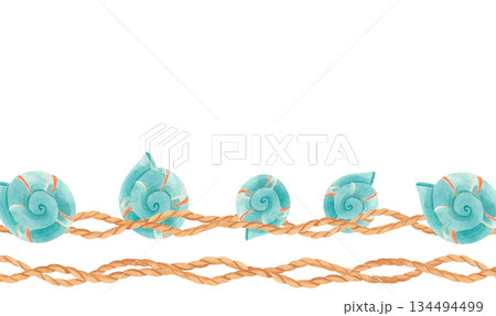 Watercolor nautical rope border with blue seashells and space for text. Vintage marine template with spiral shells and waves.
