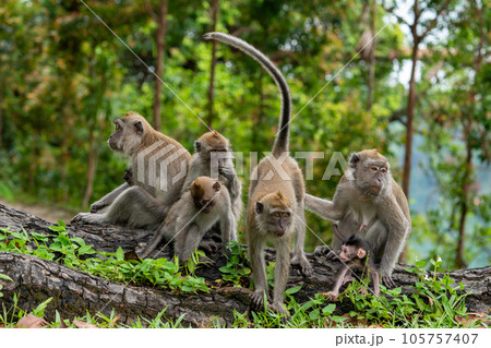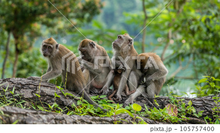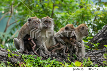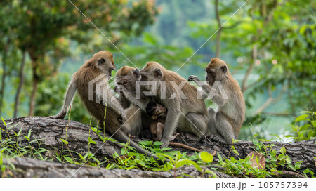 シンガポールの国立公園に住んでいるカニクイザルの家族