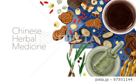 テーブルに並べられた漢方生薬手書き水彩風イラスト