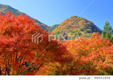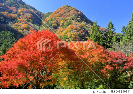 埼玉県秩父市大滝 奥秩父荒川支流の紅葉の名所大血川渓谷の紅葉もみじと山の景色