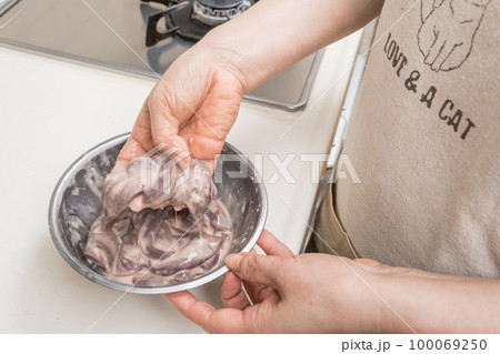 【ビールで下処理したレバニラ炒めの豚レバーを流水で洗う】