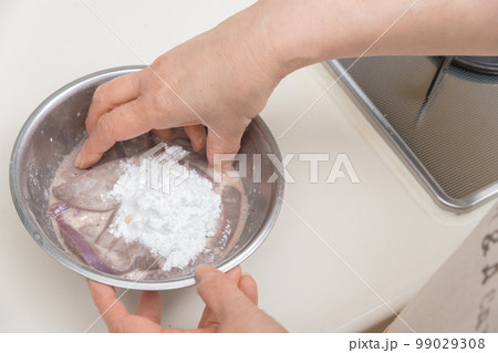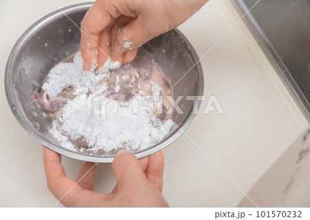【下処理が終わった豚レバーに片栗粉とサラダ油を混ぜる】