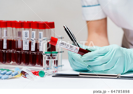 Doctor or lab scientist labelling test tube with Coronavirus patient blood sample