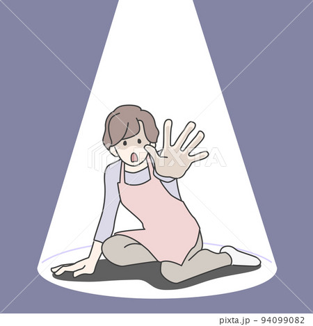 悲劇のヒロインのポーズでスポットライトに照らされるエプロンをした女性