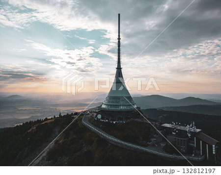 The Jested Mountain Hotel stands prominently against a backdrop of clouds and sunset. Located in Liberec, this modern architectural marvel combines beauty with function atop a mountain.