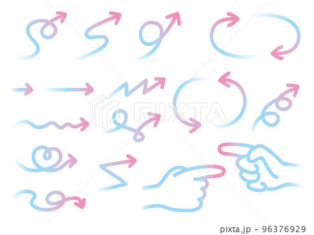 様々な形の矢印セット02(手書き・ピンクから水色・グラデーション)