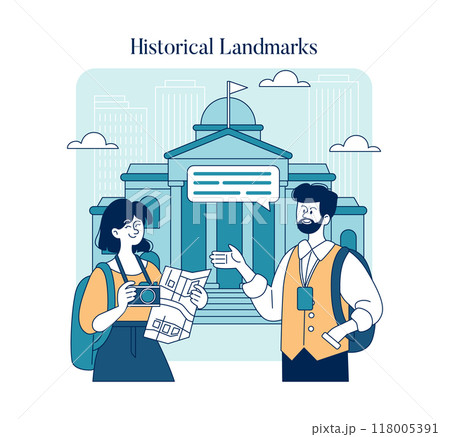 World Tourism Day concept. Tourists exploring city landmarks with map and camera. Cultural travel and sightseeing. Vector illustration.