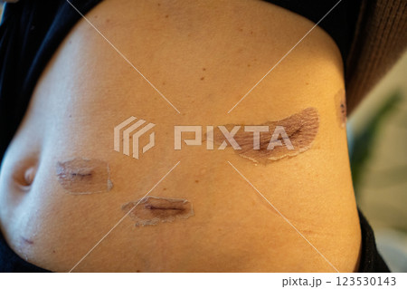 外科手術後の傷跡の経過 ― 腹部の皮膚再生と傷痕ケアのメディカルイメージ