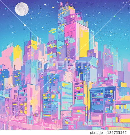 鮮やかな色彩で描かれた高層ビル群と夜空の三日月が幻想的な風景を演出する都市イラスト|静けさときらめき