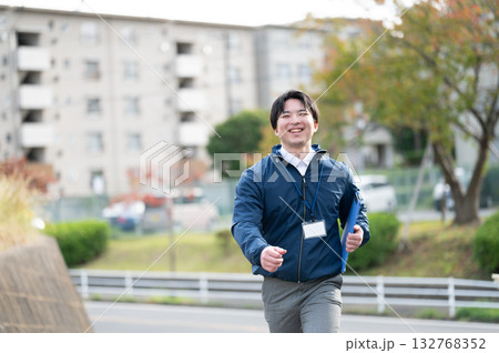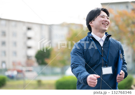 屋外でタブレットを使って仕事をする30代日本人ビジネスウーマン