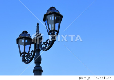 Vintage street lamp silhouette against clear evening sky. Concept of urban design, architecture detail, city atmosphere and outdoor lighting