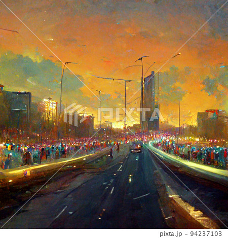 an urban city with people walking on the street and cars parked in front of buildings at sunset time, digital painting