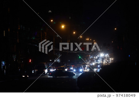 Kyiv, Ukraine - December 16, 2022: Blackout in the Ukrainian capital Kyiv. Capital streets without street lighting. Only the lights of passing cars are visible