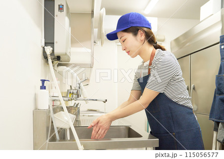 キッチンで手を洗うエプロン姿の女性スタッフ